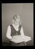 1714 En sjuksköterskas arbetsdag på södersjukhuset. Porträtt av en sköterska som sitter och läser i en bok.