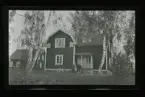 "Skoga, Äsköping Maria o Valfrid Eriksson." En familj framför sitt hus.
