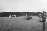 Torpedjagare i Marstrand. Förr i tiden under konungen Oskar II tid var Marstrand under sommaren ofta besök av vår flotta emedan konungen vistades där varje sommar, men nu för tiden är det sällan man ser sådana här i Marstrand.