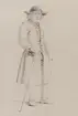 Dräkt. "Hendrik Jonsson från Glostorp, Oxie härad, skytts Härad (båda skrivet med blyerts på skissen). Man i helfigur dräkt i storformat av Otto Wallgren.