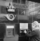 Brevlådan töms av postkontorets Stockholm 40 personal. Den fyllda postsäcken byts ut mot en tom.