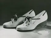 "Sommarskor, promenadskor". Tvåfärgade skor med plös, perforerad dekor, klack.