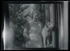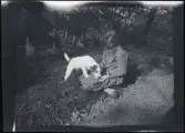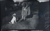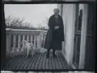 Två unga kvinnor, Elsa t.h., med en hund emellan sig, sitter på trappan till familjen Morthensens villa Solveden, Djursholm.
