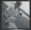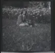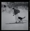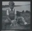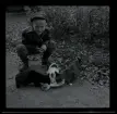 Porträtt av en ung man som står utanför ett hus. Han håller en hundvalp i famnen.