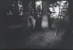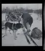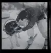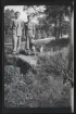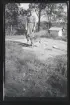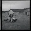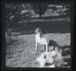 Porträtt av en ung kvinna som står utanför ett hus. Hon håller en hundvalp i famnen.