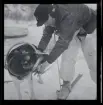 En man och en kvinna försöker få några katter att posera i en karmstol, utomhus.