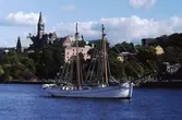 Oidentifierad 3-mastad fullriggare (skolfartyg?) i Stockholm; till v i bakgrunden pansarskeppet SVERIGE
