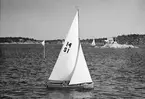 Sjöhistoriska museet sett från Djurgårdsbrunnsviken. Motorbåt och optimistjollar från museets seglarskola på vattnet i förgrunden.