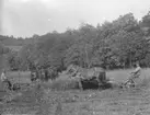 3 st. Nordsvenska hästar drar ett slåtteraggregat på Ersgårdens ägor, 1930.