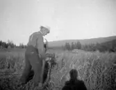 Hoppet, Svartandal, slåtter. Foto 1914. Jonas Larsson "Furbo Jon" med fru Greta och dottern Brita-Kejsa.