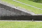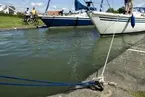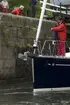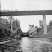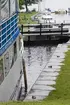 På bilden syns två sjömän som står vid relingen på jagaran Öland som ligger i slussen Brunsbüttel.
