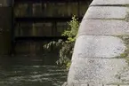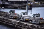 På bilden syns en sjöman som står vid relingen på jagaran Öland som ligger i slussen Brunsbüttel.