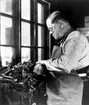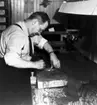 "Skomakarnas ålderman" Robert Carlsson halvsular efter den gamla metoden. Från utställningen "Falköping i bild" 1952.