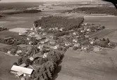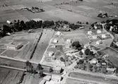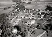 Flygfoto över stationen Station anlagd 1921. En- och enhalvvånings stationshus i trä. Omfattande reparationer 1945