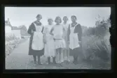 "Personal hos fröken Tamm, Fogelstad." Fem kvinnor runt ett bord dukat med kaffekoppar och kakor.