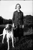 "Ingrid i Svängen" står utomhus med en stor, strävhårig hund i koppel. Hon var gift med "Karl i Svängen" och de bodde i svängen där vägen till Stättared går in från Källsmossen.
