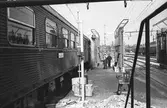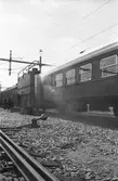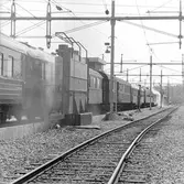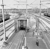 Statens järnvägars SJ F 627 lok som backar in genom portarna i vagnhallens sydöstra gavel för att hämta de färdiga tågsätten, på personbangården i Hagalund.