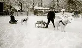 Fotografi från expedition till Spetsbergen. Motiv av häst som drar man på en kälke. Bredvid står en hund.
