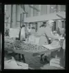 Försäljning av italienska produkter. Kunder framför försäljningsbord, manlig expedit i vit skjorta och förkläde. "Italiana" 1953 på NK (Nordiska Kompaniet) i Stockholm. Skylt "Antipasto".