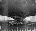 Någon minut före starten. I gondolen står Andrée längst till vänster, bredvid honom Strindberg. Mellan dem skymtar Fraenkels rygg och nacke.