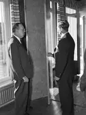 Drätselkammarens ordförande Tycho Hedén, redaktör Axel Johansson och landshövding Sigfrid Linnér åhörare på möte, sannolikt på Uppsala slott, Uppsala, 1941