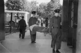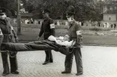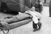 "Karantänsförläggning" på Kvarnbyskolan för flyktingar från koncentrationsläger i Tyskland 1945. Flykting som blir inburen på bår av Röda Kors personal.