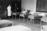 "Karantänsförläggning" på Kvarnbyskolan för flyktingar från koncentrationsläger i Tyskland 1945. En sovsal med sängar samt en sköterska och en man från Röda Korset.