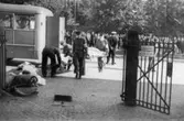 "Karantänsförläggning" på Kvarnbyskolan för flyktingar från koncentrationsläger i Tyskland 1945. Flyktingar bärs in på bår av Röda Korsets personal.