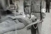 "Karantänsförläggning" på Kvarnbyskolan för flyktingar från koncentrationsläger i Tyskland 1945. Manlig flykting blir buren på bår av Röda Korsets personal.