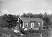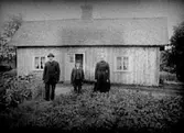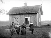 Torp i dåligt skick under Lindhovs kungsgård som ligger i Lindbergs socken norr om Varberg. Familjen står på gården med bostadshuset till höger och ladugården till vänster.