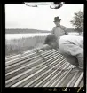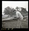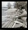 En man sitter och lagar fiskenär. Intill honom står höga travar med trälådor staplade.