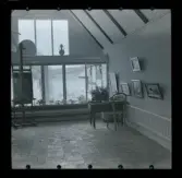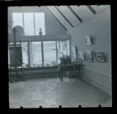 Fotografens anteckning: ”33. Etnografica enl. Dahlbäcks Lansjärvs-katalog, foto 1930. Se från h. till v. på bilden: Nr 94 t, fragment av utdragssäng. Utskurna lister bl.a. antika flätbandet. Blek röd bottenfärg, buskmålad. Listerna i grönt, gult, mörkblått. Målningsåret 1851. Nr 502 hörnskåp i 2 delar. Rosa målat. Nr 517 stol, h 75,5 cm. Se bild nr 40. Utdragssäng, se bild nr 20, 22."