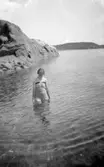 Fotografi från kuvert märkt med "Ernst Nordenskjöld". Motiv av pojke som står på stenig strand vid flod i djungeln.
