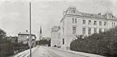 Järnvägsgatan vid mitten av 1880-talet. På bilden synes det av Skaraborgs läns allmänna sparbank 1874 uppförda bankhuset, som sedermera försålts och påbyggts med en våning. Det nuvarande stora bankhuset invid det förra uppfördes 1904.