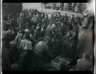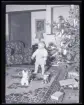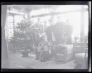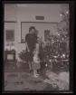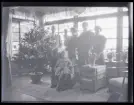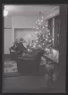 Sällskap som samlas kring julgranen.