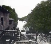 Sågverket. Andra änden på såghuset, färdiga plank staplas.