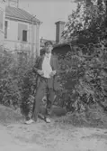 "John i lövsalen. 16/8 1908. Av R. L." Man stående i trädgård.