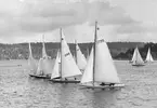 Från Höstseglingarna i Saltsjöbaden 1946, enmansseglingen 14 september. Starbåt 2126 STARDUST ses i förgrunden t h, de andra båtarna på bilden är fr v t h starbåt 904 VÄSTAN, folkbåt F-S120 EJDERN (b. 1946, konstr. Tord Sundén) samt starbåtarna HUX-FLUX II, 1804 SEA STAR, 860 TORPÃN och 1798 LOTTA IV. I bakgrunden t h ses 5m-jakten 5-S85 SPINDRIFT (b. 1945, konstr. Jac. M. Iversen).