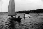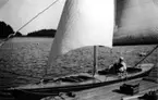 Gunnel Madgård f. Abrahamsson f.1919 vid "vår" badstrand (servitut). Badrocken blå, sommaren 1956.