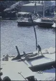 Modellen av Vasa i skala 1:10 justeras på plats i Vasamuseet. Fr.v. Stefan Bruhn, Göran Forss, Lars Thorhagen och i bakgrunden Carl-Gunnar Olsson.