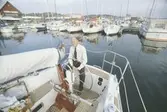 Albin Nova vid brygga i Fiskebäcks hamn. Representant från Albin Marin i sittbrunnen.