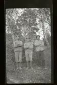 "August A-n Albin Karlsson, Filip Karlsson, Backa" Porträtt av tre arbetare som poserar med armarna i kors.