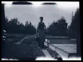 "Fogelstad, Axel och Ivar lägger grund till källare." Två män arbetar med ett stenblock, Axel Fredriksson till vänster.