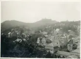"Utsikten från Fürstenhof, Wartburg i bakgrunden". Utsikt från hotellbalkongen mot Eisenach och borgen.