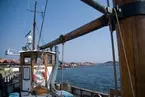 Fiskebåten LL 667 ASTA AV SMÖGEN. I bakgrunden en ledfyr på en klippa.