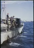 Veteskaplig expertis till bärgningsplatsen. Fr.v: Civiling.Sven Jansson, prof. E. Rudberg och teknolog Dag Hartman ombord på Waria den 18.4.43.
