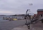 Kravellbyggd motorbåt ("Petterssonbåt") på båtvagn vid Pampas marina. [Text diaram:] SOLNA/PAMPAS 2006:11