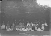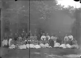 Enligt text som medföljde bilden: "Fru Bogren, Konsul Radhe, Professor Murray, Kamrer Hallgren, Dr. Landelius, Professor Wide, Fröken Lotta Husberg, Fröken Emma Hasslöf, Fröken Hansson och Fröken Anna Olsson." Enligt text som ristats i emulsionen: "... och Betjäningen vid Lysekils badanstalt sommaren 1901."