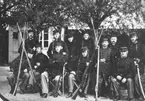 En man i militäruniform. Han har en ryggsäck och ett gevär med bajonett.