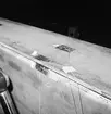 Balk som ligger precis på utsidan av styrbordssidan är försedd med knoppar. Urtag för bordläggningen syns även i detta fall tydligt. Notera även ett större metallfat som ligger precis under balken. Området i fotografiet är precis utanför byssan.